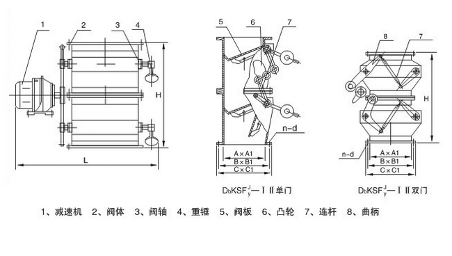 雙層電動卸灰閥又名鎖風喂料機,由減速器帶動傳桿通過曲柄、凸輪及連桿分別帶動上、下兩傳動軸旋轉,交互開啟,通過配備的杠桿系統或拉伸彈簧,保證閥板可靠的復位,防止野風吹入,依確定的開閉頻率完成系統的給卸料。該機結構緊湊,工作平衡可靠。廣泛適用于建材、冶金、化工、電力等行業,作為各類除塵設備的 灰斗卸料裝置及各種磨機、烘干機、料倉等設備的給卸料裝置。